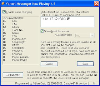 – Untuk setting pada WMP cukup masuk pada menu Tools ~> Plug-ins ~> centang pada messanger data plugin. maka akan secara otomatis musik yang kita putar di WMP akan tampil di status YM kita..